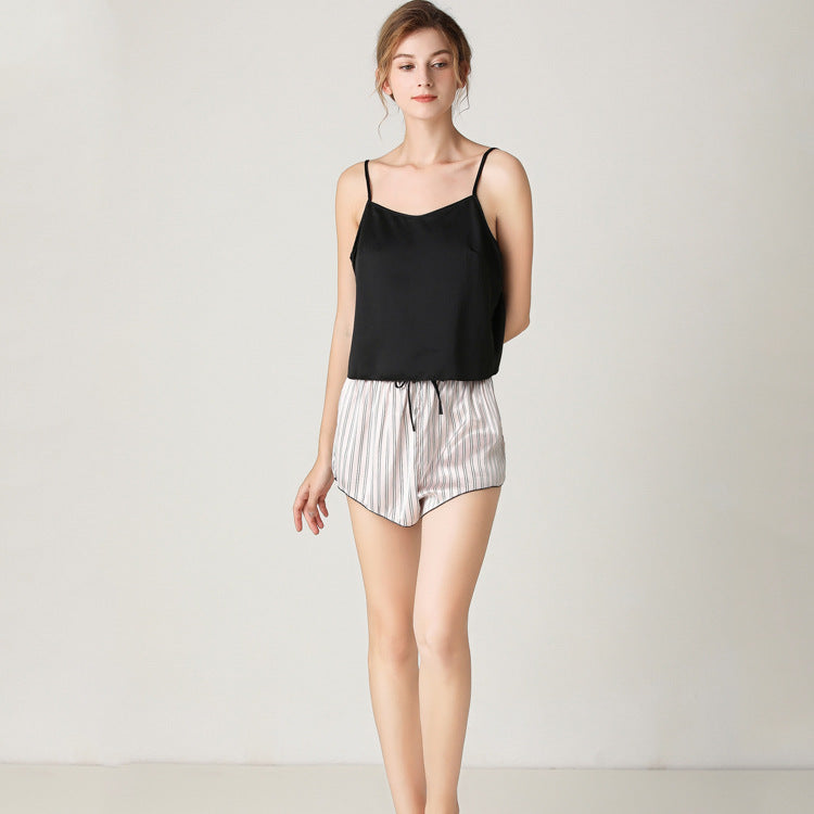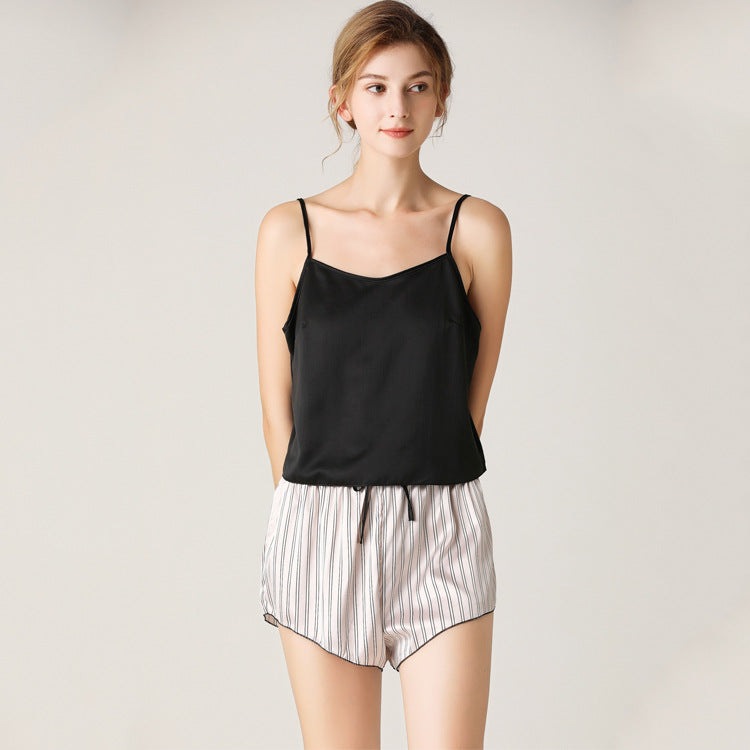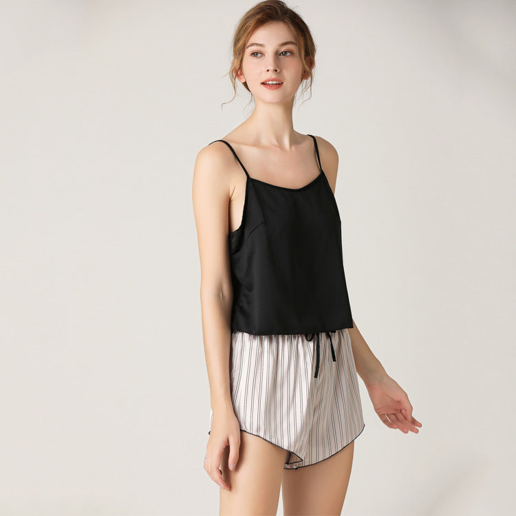 Das Set aus zweiteiligem Freizeit-Tanktop und gestreiften Shorts für Damen ist ein schlichtes Pyjama-Set, das die ganze Nacht über bequem ist. Es hat Spaghettiträger oben und eine elastische Taille an den Shorts.