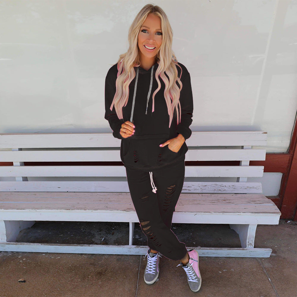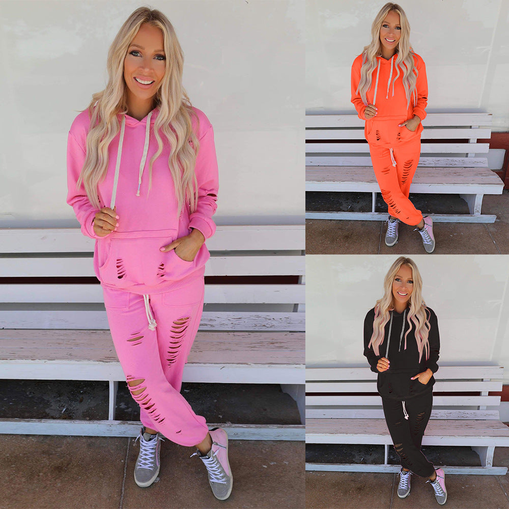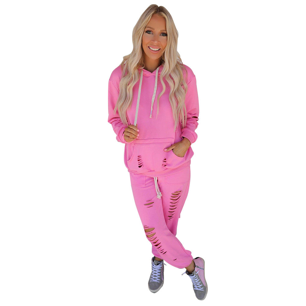 Egal, ob Sie Besorgungen machen oder sich zu Hause entspannen, das zweiteilige Set aus Hoodie und Jogginghose für Damen im Ripped-Look ist eine niedliche Art, sich anzuziehen. Es verfügt über eine Kängurutasche und eine Kapuze mit Kordelzug an der Jacke.