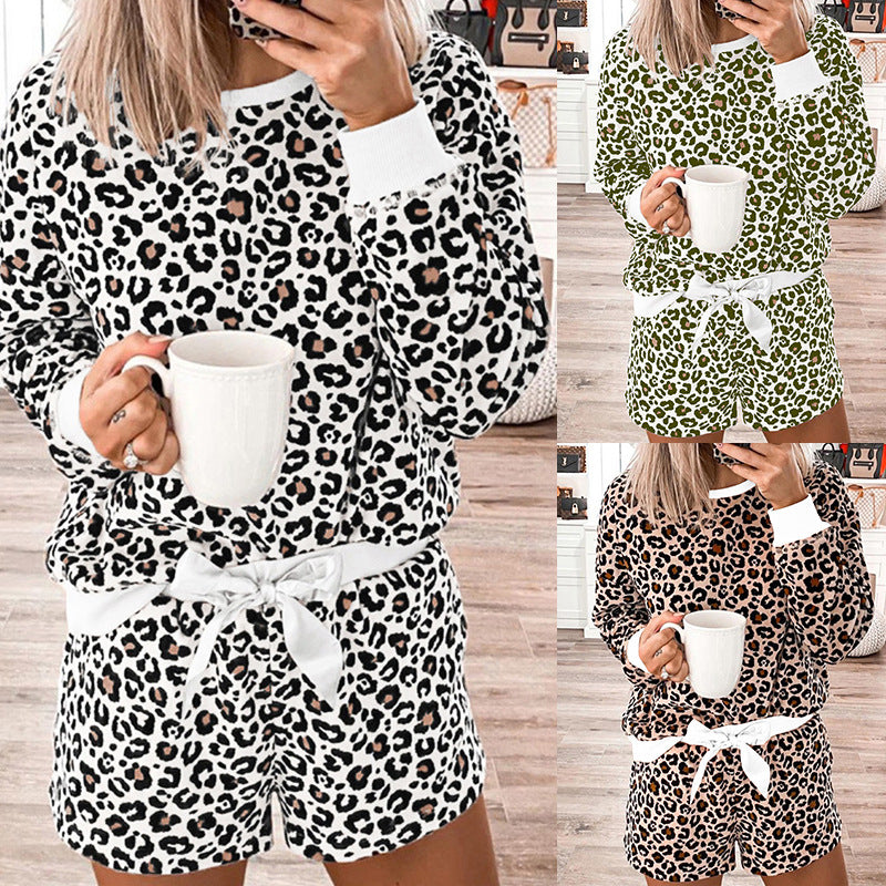 Fühlen Sie sich wild, während Sie sich zu Hause entspannen, indem Sie das zweiteilige Lounge-Set mit Leopardenmuster und langen Ärmeln für Damen tragen. Es verfügt über ein Paar passende Shorts mit elastischem Bund und einer Krawatte, um die Passform anzupassen.