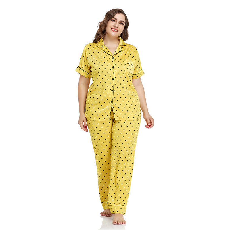 Machen Sie es sich für die Nacht gemütlich in diesem niedlichen zweiteiligen Damen-Pyjama-Set mit Polka Dot-Kragen und Hose, das aus seidigem Material und einer Knopfleiste vorne besteht. Sie sind entweder in Blau oder Gelb erhältlich.