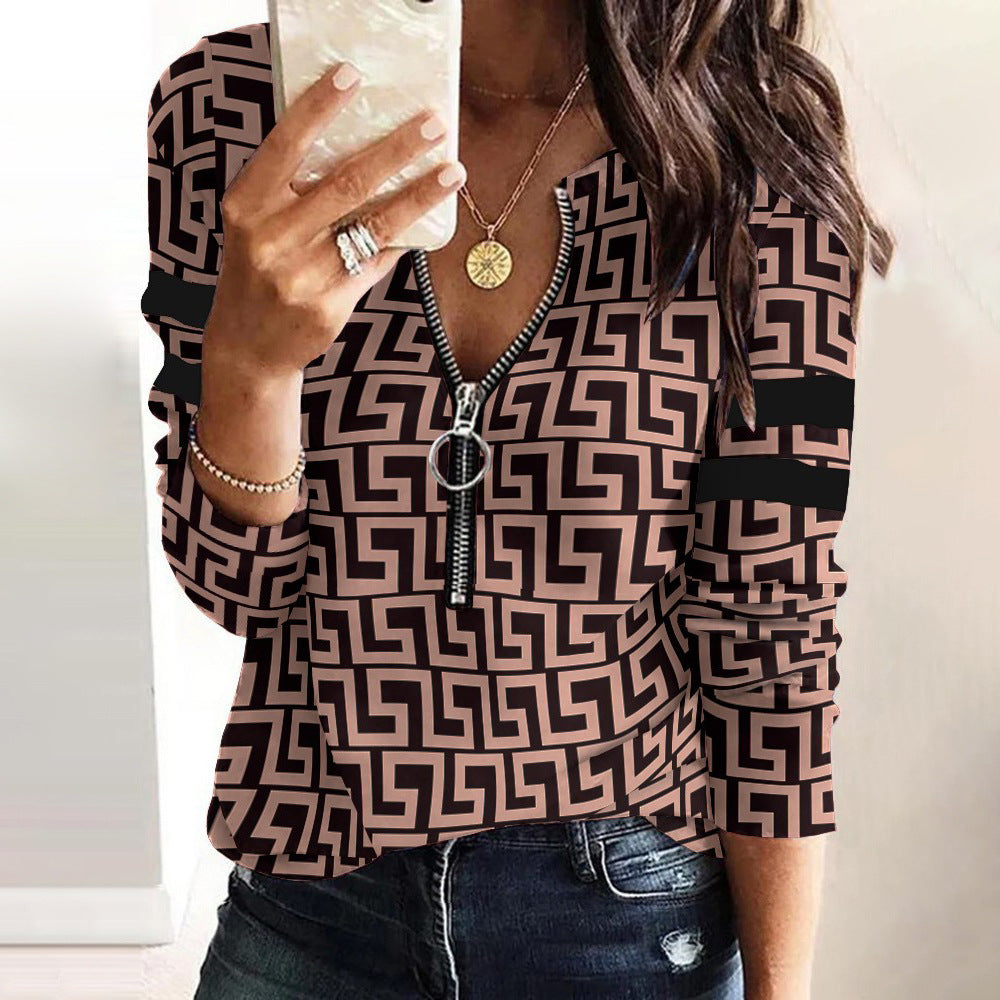 Get the look of designer clothes wearing the Women's Long Sleeve Logo Shirt with Metallic Zipper Closure that features a zipper running the length of the midriff and a V-neck created by unzipping it.