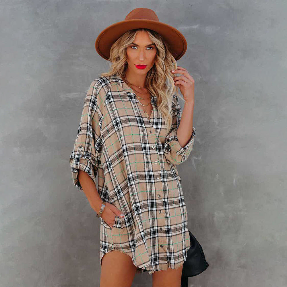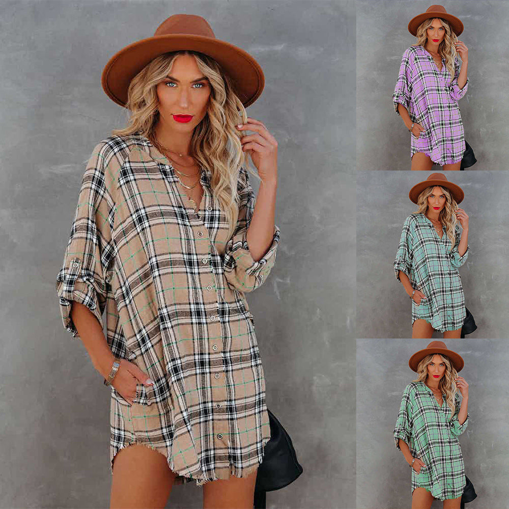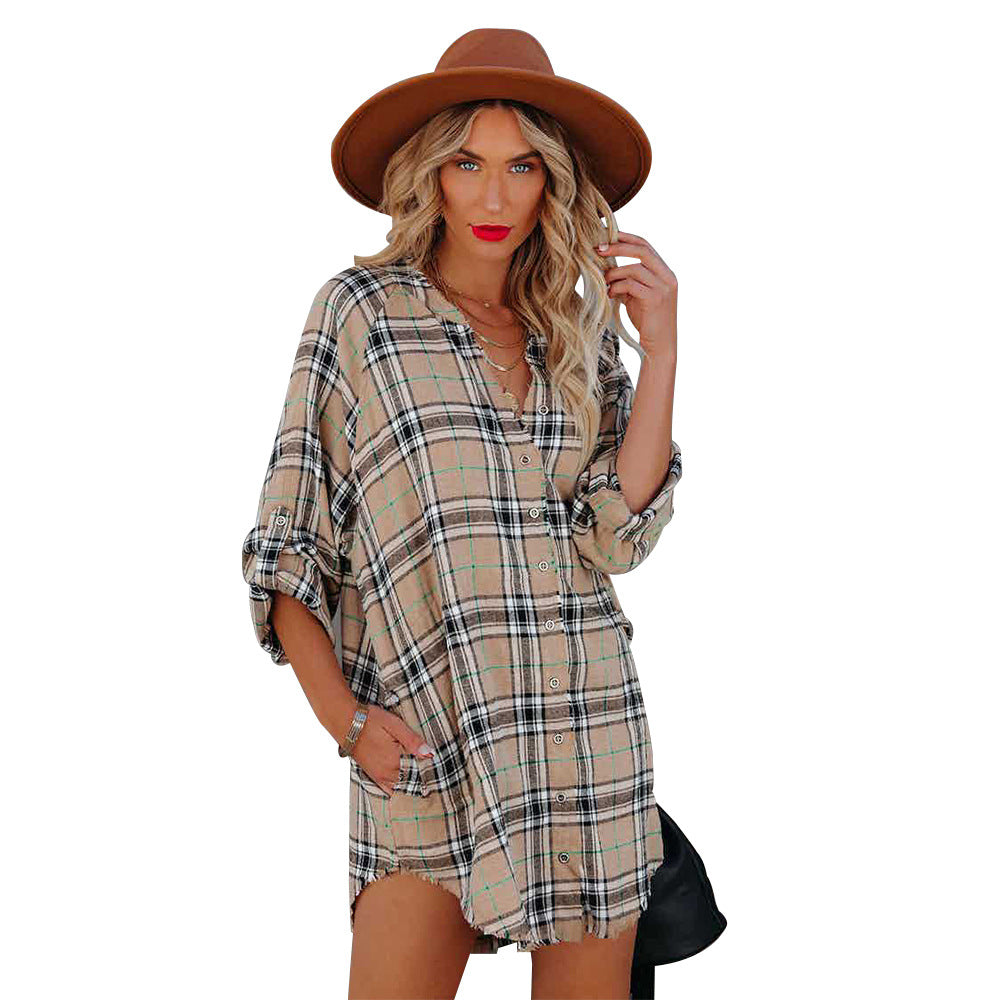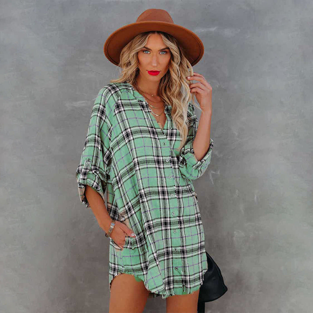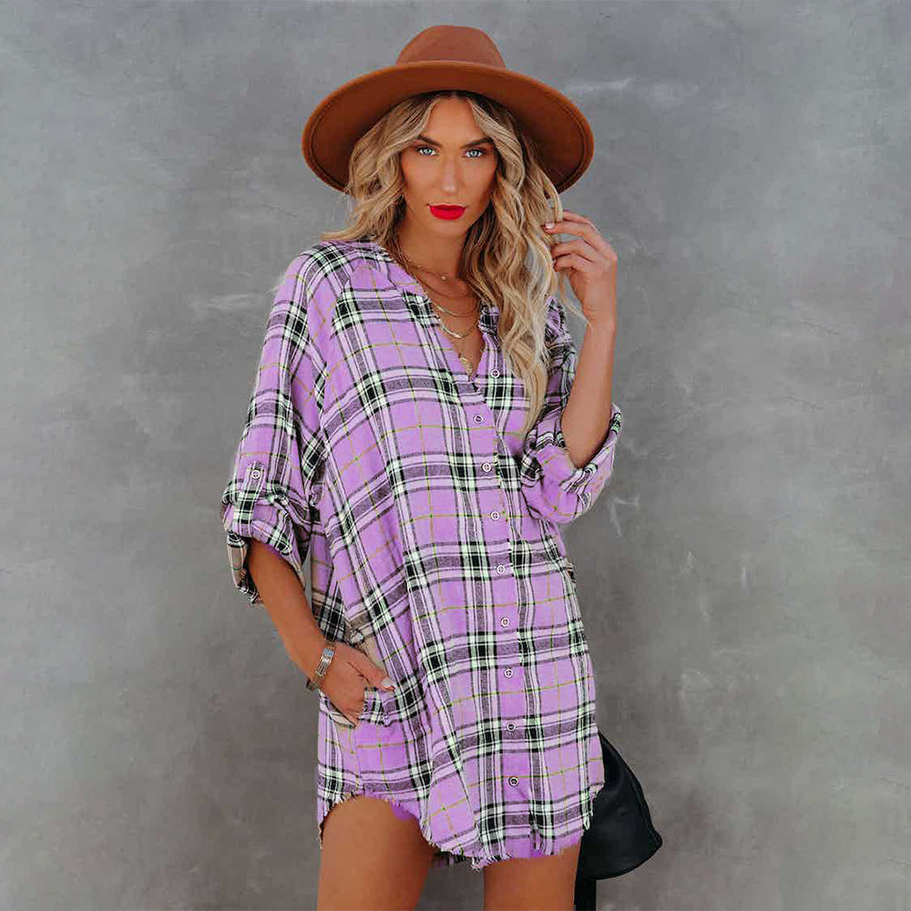 Transform the classic appeal of flannel into a brand new style with this Oversized Flannel Mini Dress Style Shirt with Three Quarter Length Sleeves. This V-neck flannel shirt comes in your choice of three colors.