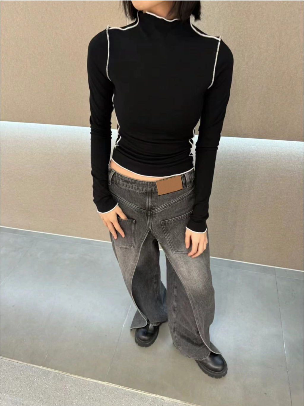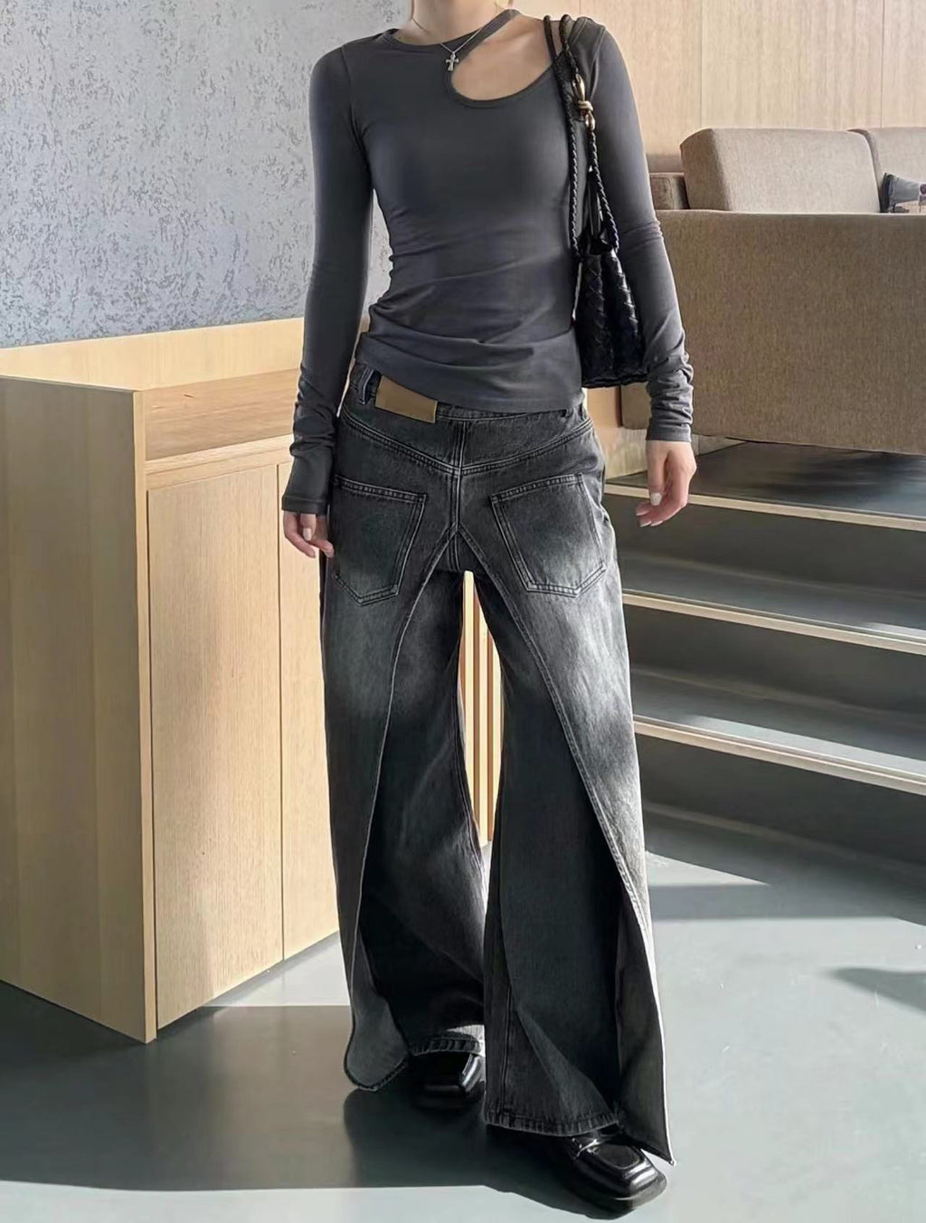 These deconstructed jeans offer a reversible design with distressed detailing and a unique banana-leg shape. The vintage wash adds character while the relaxed fit ensures comfort. A standout piece for edgy, experimental fashion.