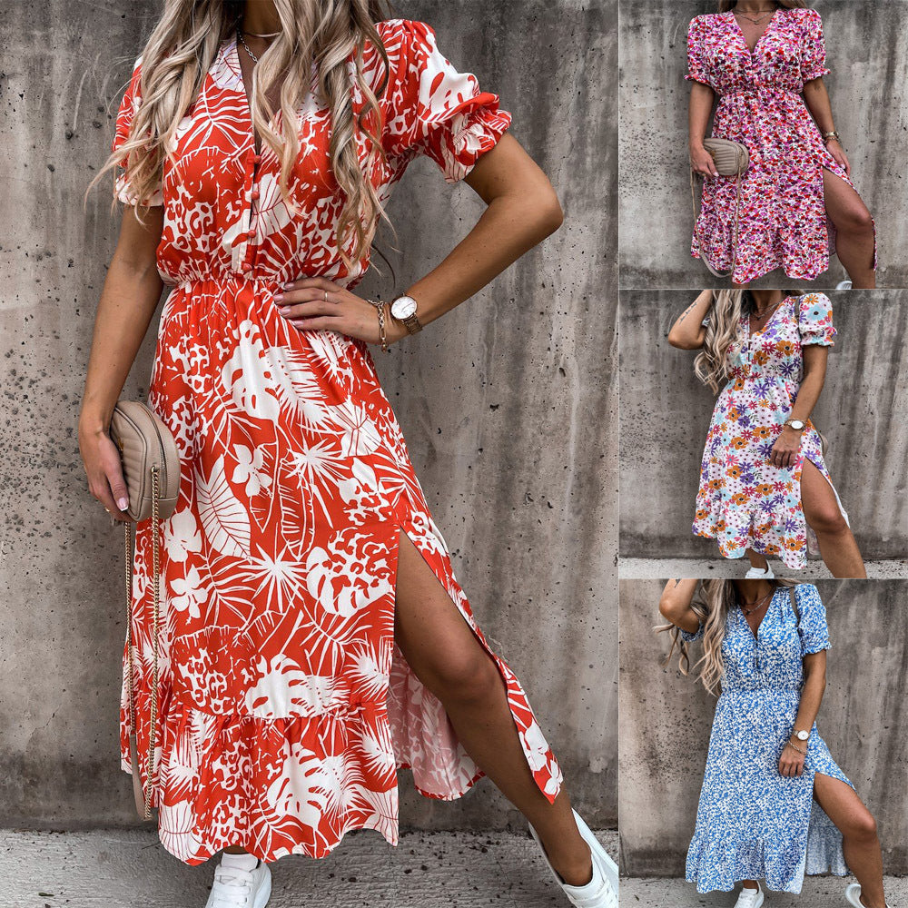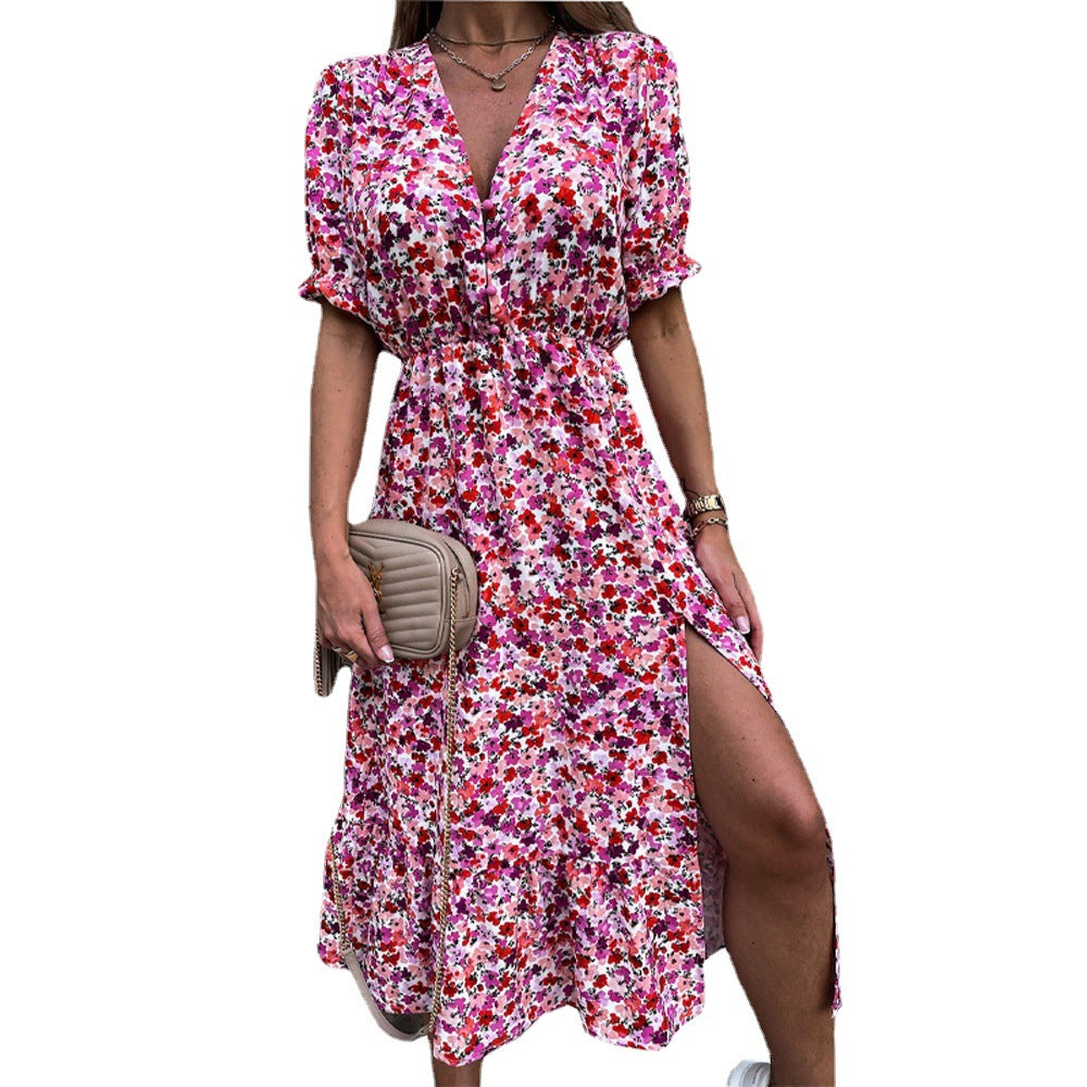 Look the part this spring wearing the Women's Short Sleeve Cinched Waist V-Neck Midi Dress. This colorful dress is characterized by its floral print and vibrant color options.