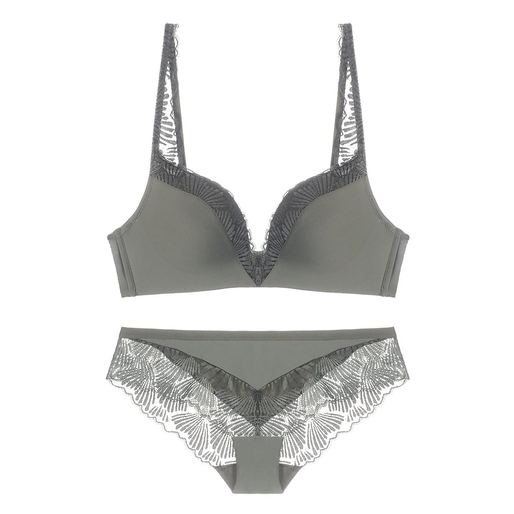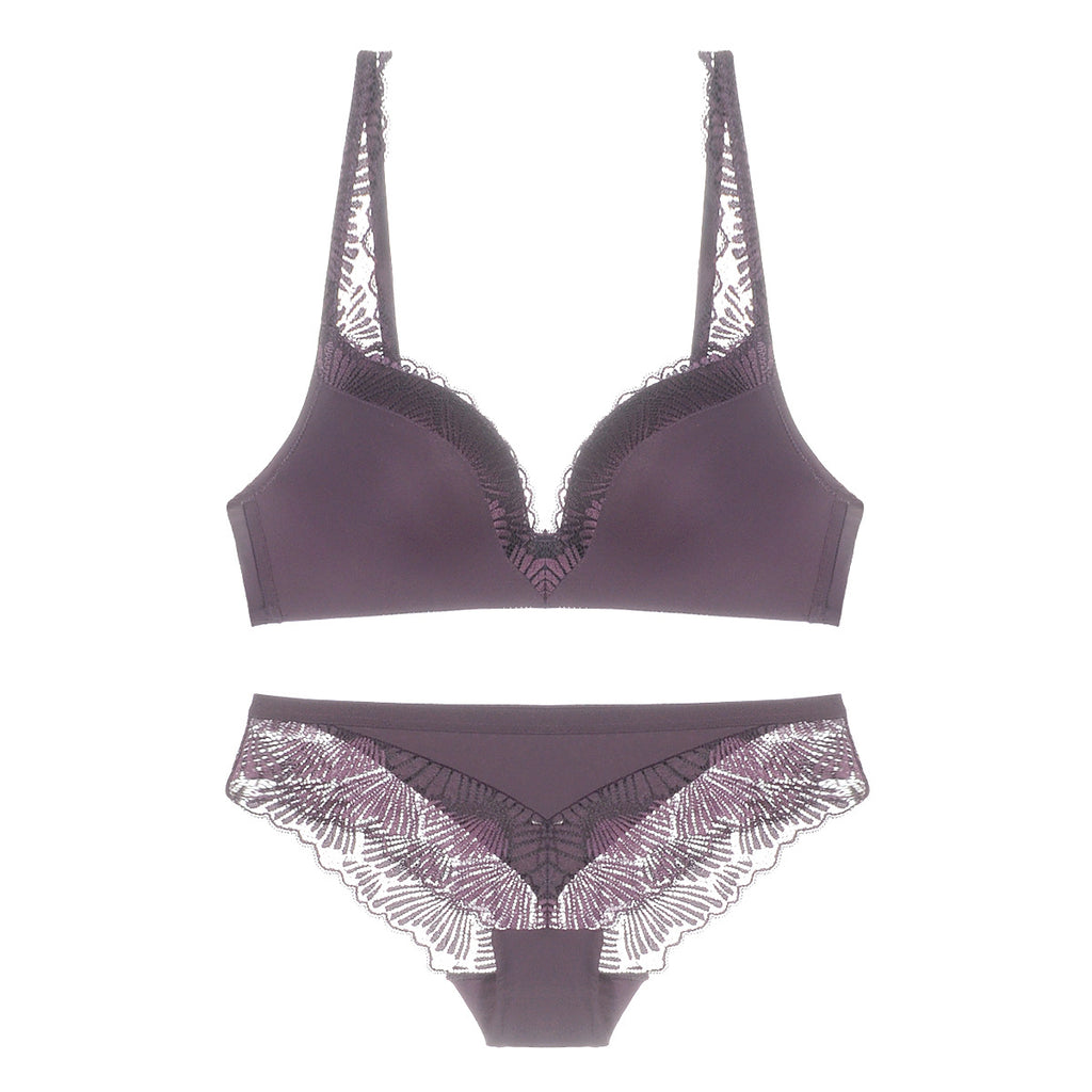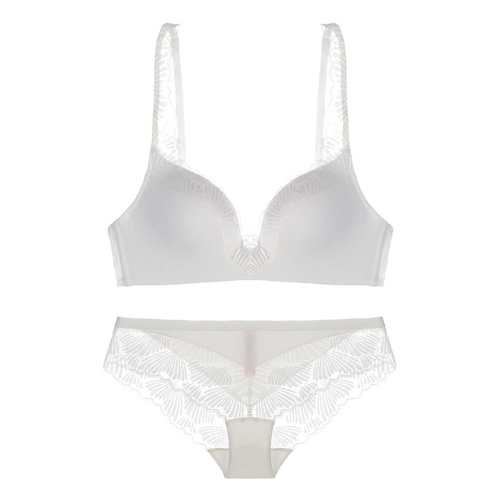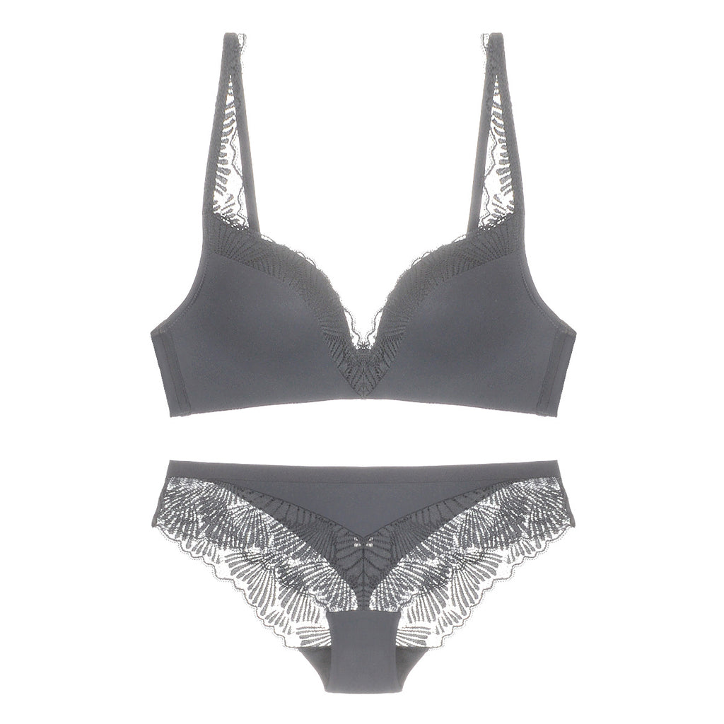 Thin, lacy straps on the bra match the lacy cutouts on the panties of the Smooth Cup Lace Trim Bra and Panty Set for a streamlined, low-key appearance.