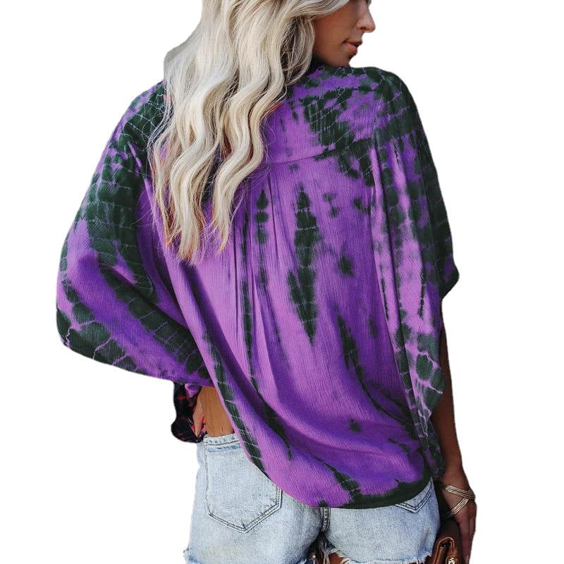 Spice up your casual ensembles wearing the Women's Steep V-Neck 3/4 length Sleeve Button T-Shirt. This loose-fitting casual shirt is breezy and cool with tie-dye hues and patterning.