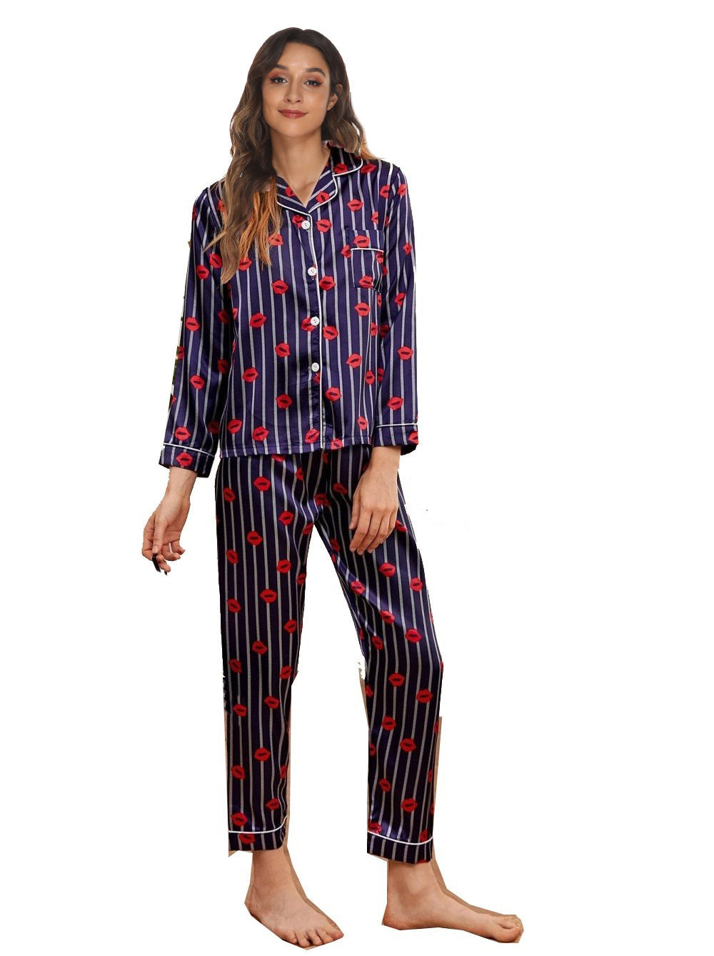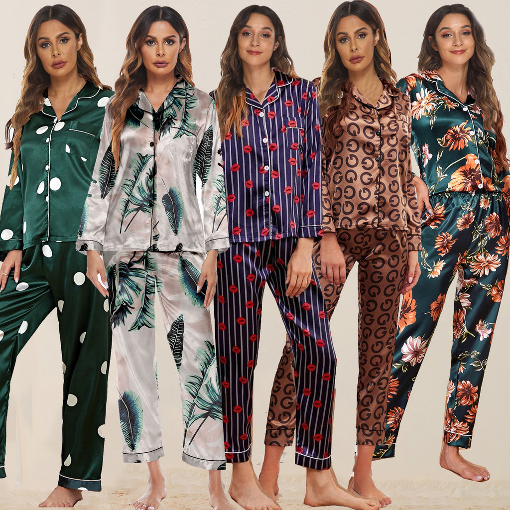 Dress for your comfort in the Women's Two Piece Pajama Set with Botanical Designs featuring a long sleeve collared shirt with buttons as well as a pair of matching silky pants.