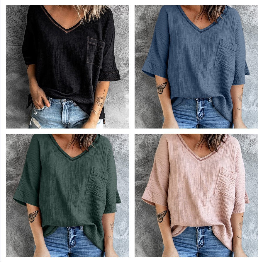 Casual and chic, the V-neck Three Quarter Length Tee with Oversized Pocket is a cute top for casual daily wear. The top features a texture feel that makes it stand out from other such blouses.
