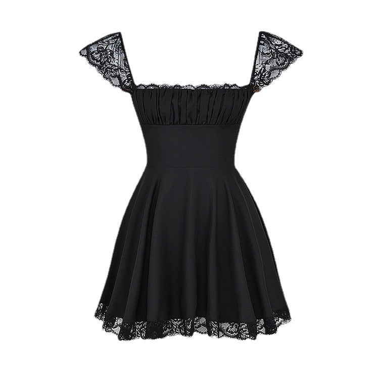 Change up your summertime wardrobe with the Women’s Black Lace Midi Dress with Short Lace Sleeves. The dress features an A-line waist and comes in a neutral black hue.