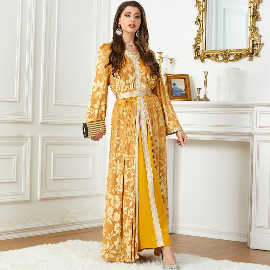 The Women's Long Sleeve Floral Print Robe Style Dress is an elegant and sophisticated way to dress for a special occasion or night out. It comes in your choice of royal purple or gold.