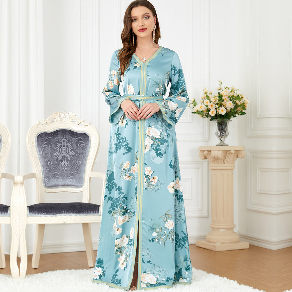 Silky and chic, the Women's Long Sleeve Light Blue Floral Gown is the perfect choice for a springtime evening event. It features sleek, soft loose-fitting fabric.