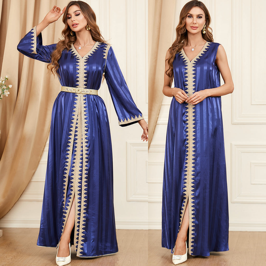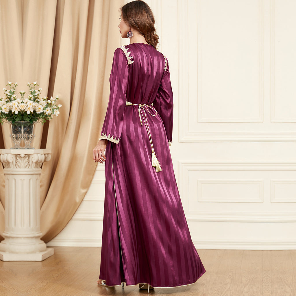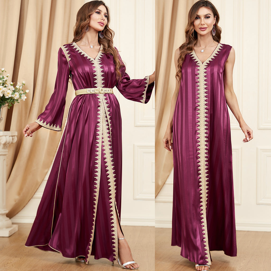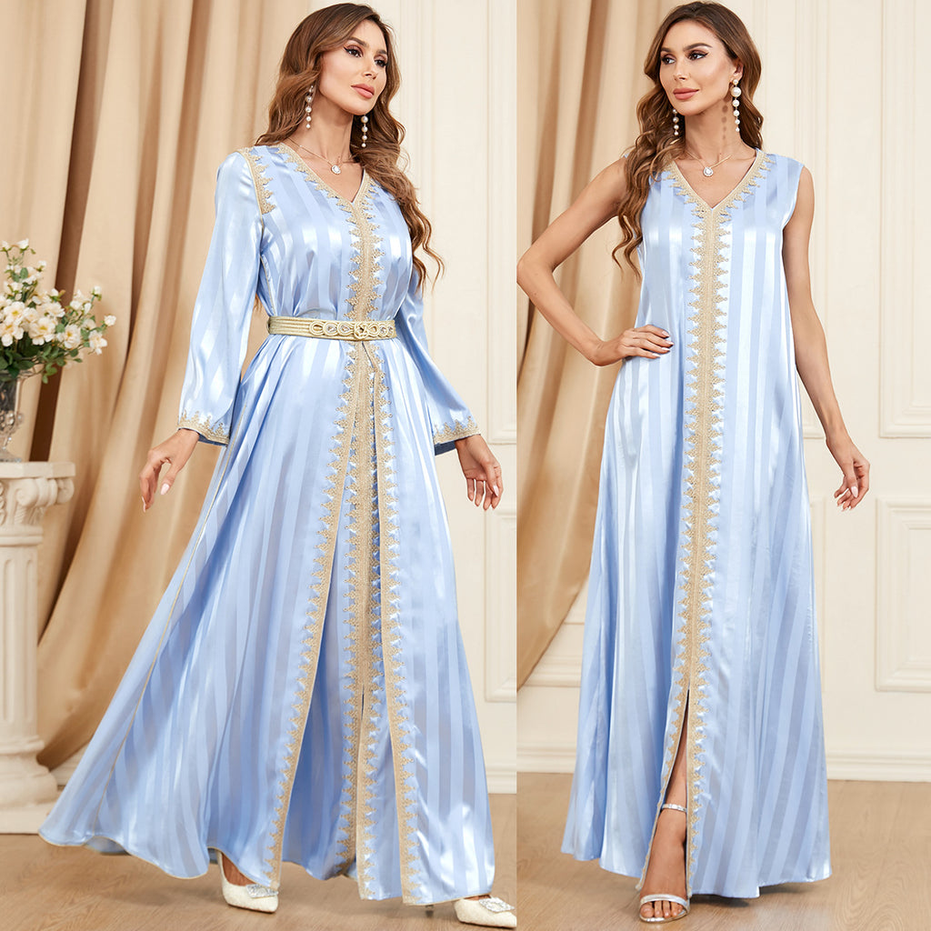 Feel like royalty in the luxurious Women's Long Sleeve Shimmery Maxi Dress. It comes in your choice of crimson, light blue and dark blue with golden trim.