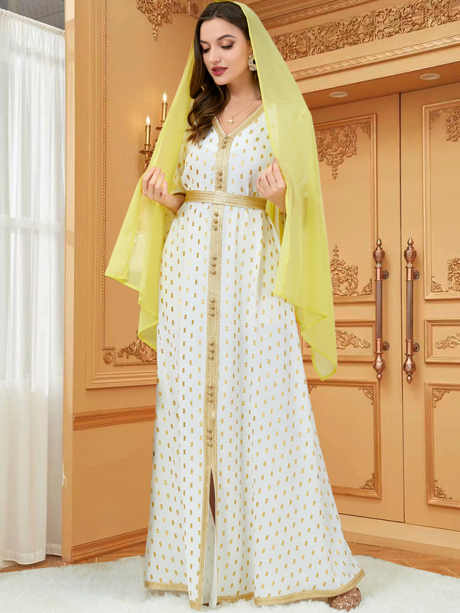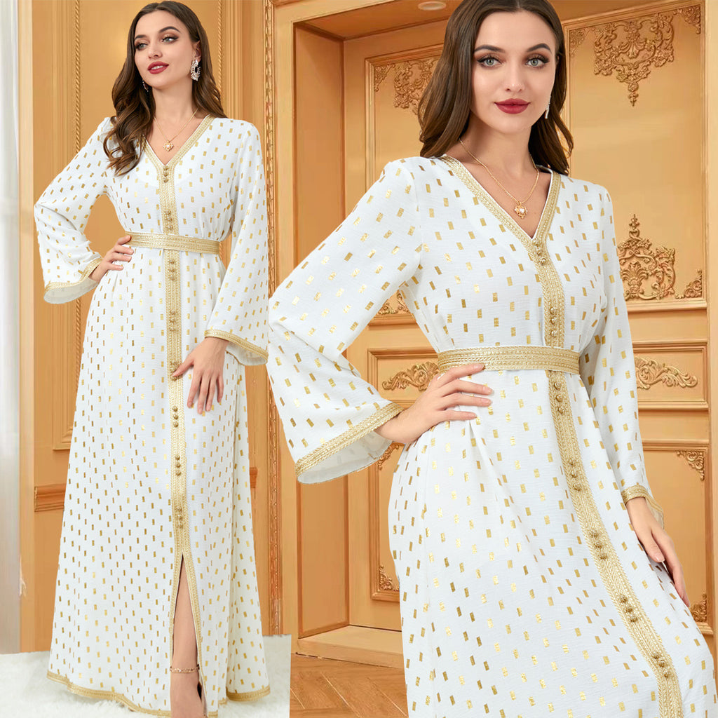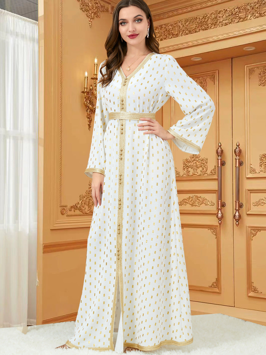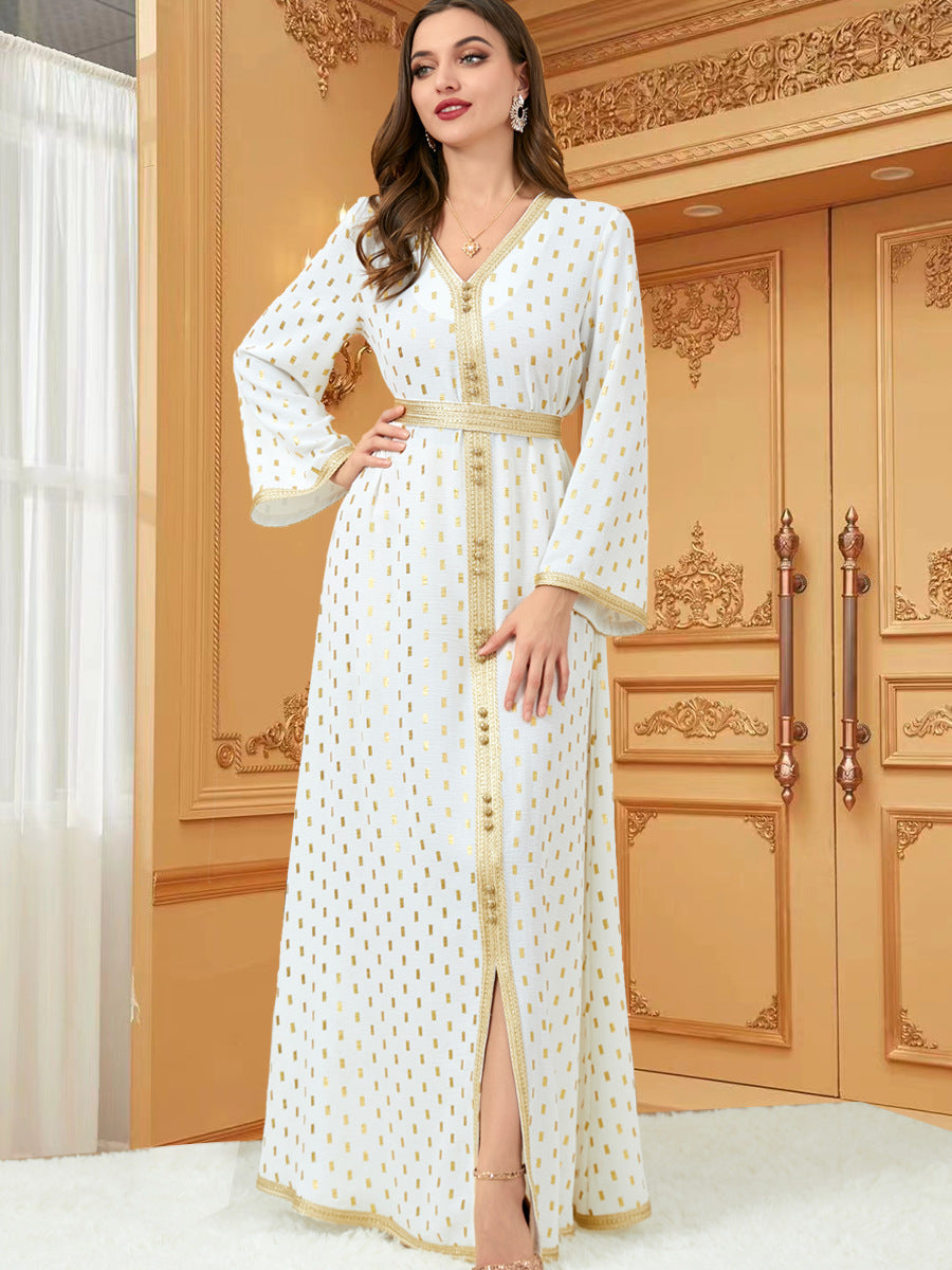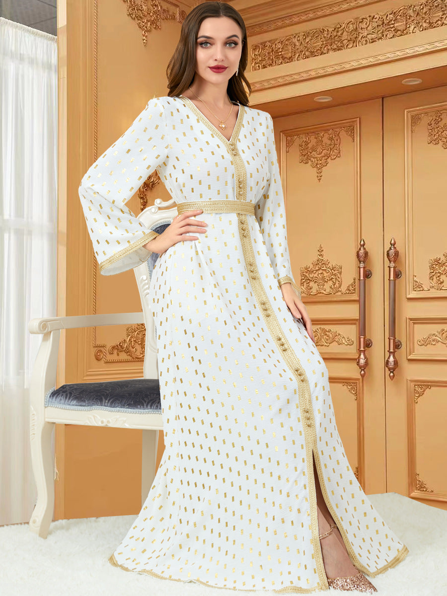With its crisp white hue accented with golden flecks, the Women's Long Sleeve White and Gold Maxi Gown is a simple and straightforward, yet stylish choice for any occasion.
