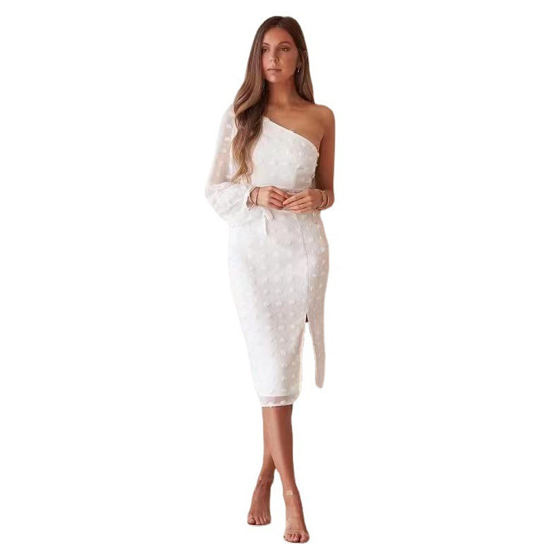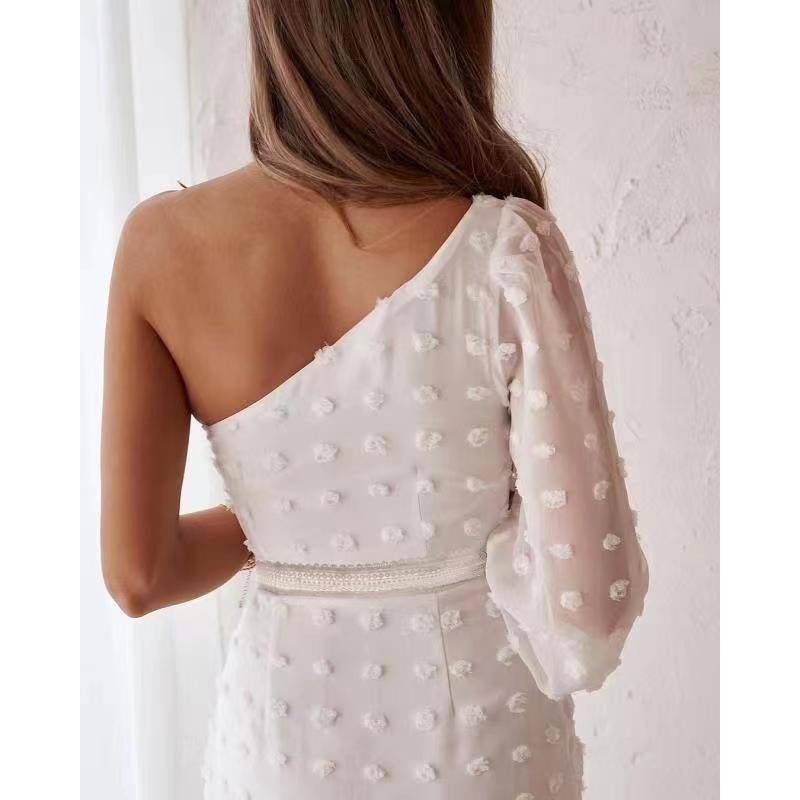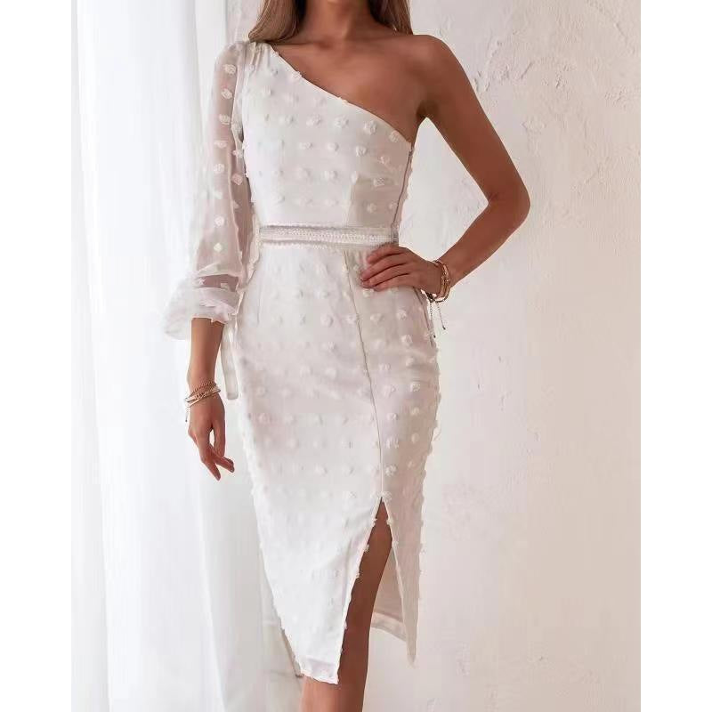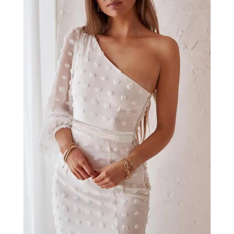 The unique mix of textures on the Women’s Off the Shoulder Long Mesh Sleeved Midi Dress makes it stand out from the rest, including its sheer sleeve and puff balls on the dress itself.
