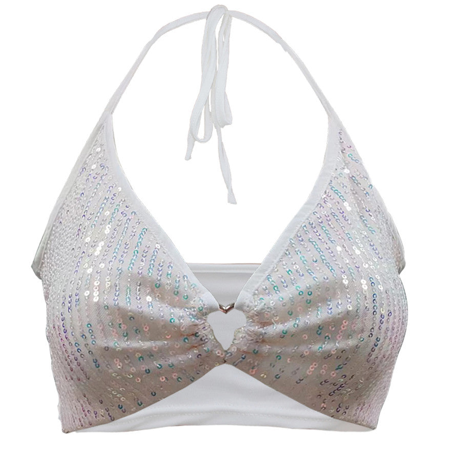 Wearing the Women’s Sequined Crop Top with V-Neck, you can look cute on any beach day. It comes in black or white and features a heart cutout in the center.