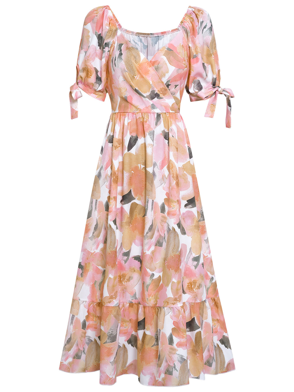 Get in the springtime spirit wearing the Women’s Short Sleeved Floral Print Midi Dress, featuring a sweetheart neckline and ties around the sleeves for a unique finishing touch.