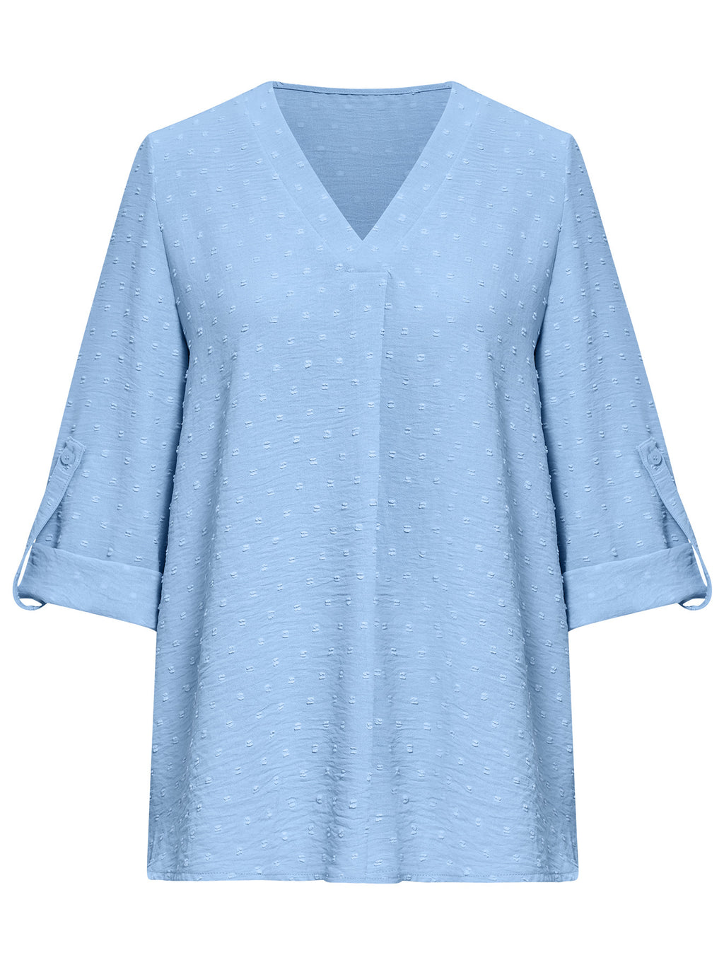 Dress to impress no matter what you’re doing when you wear the Women’s Three-Quarter Length Blouse with V-Neck available in cream, blue or green.