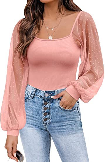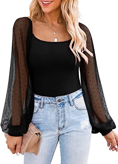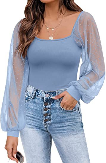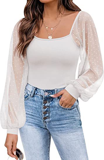 Women's Long Sleeved Sheer Sleeves Square Neck Tops