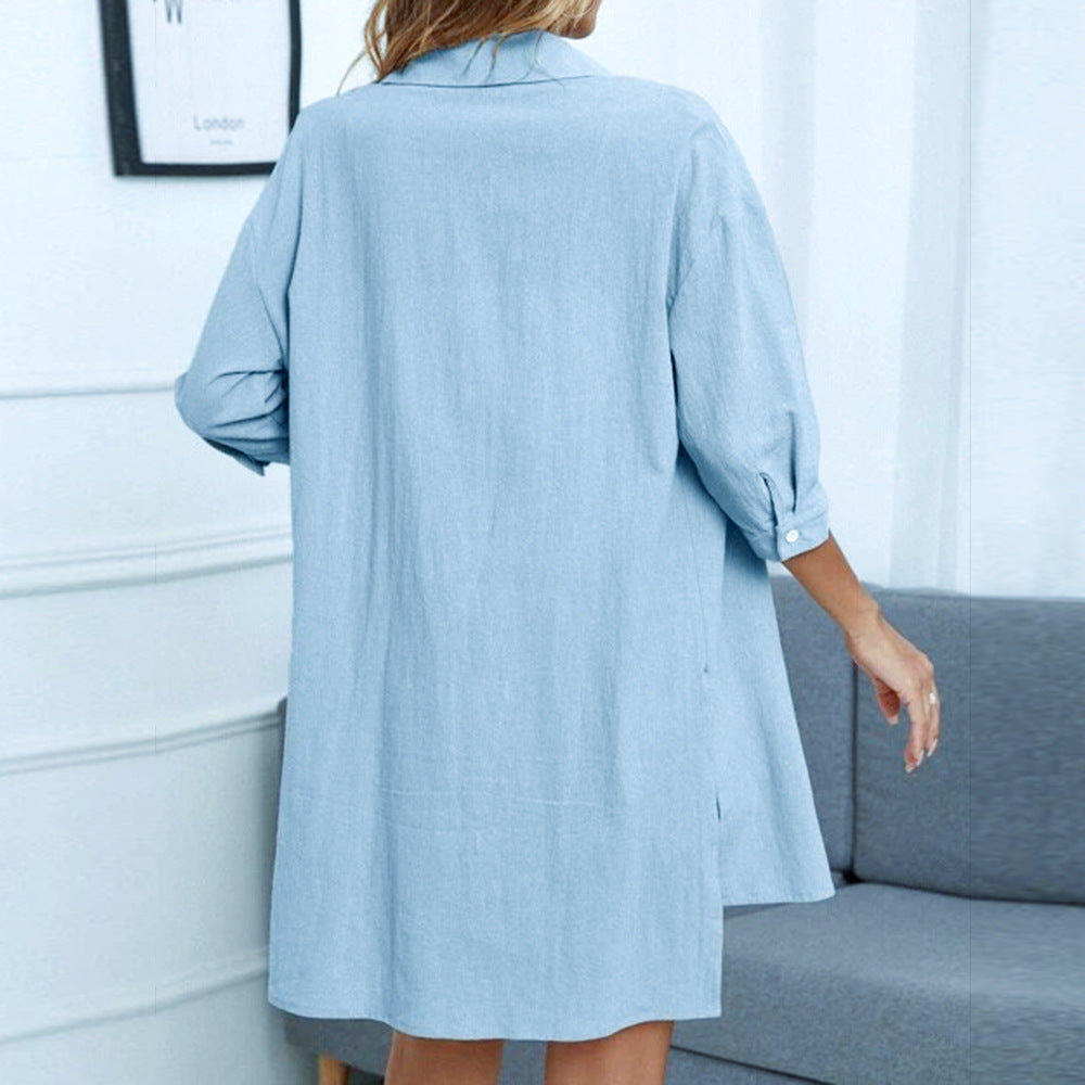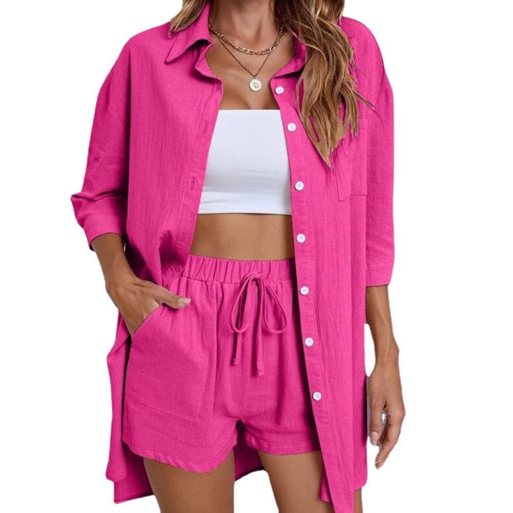 Lounge around in comfortable style wearing the Women's Pajama Set with Drawstring Shorts and Three Quarter Length Shirt. It comes in a light denim or hot pink color.
